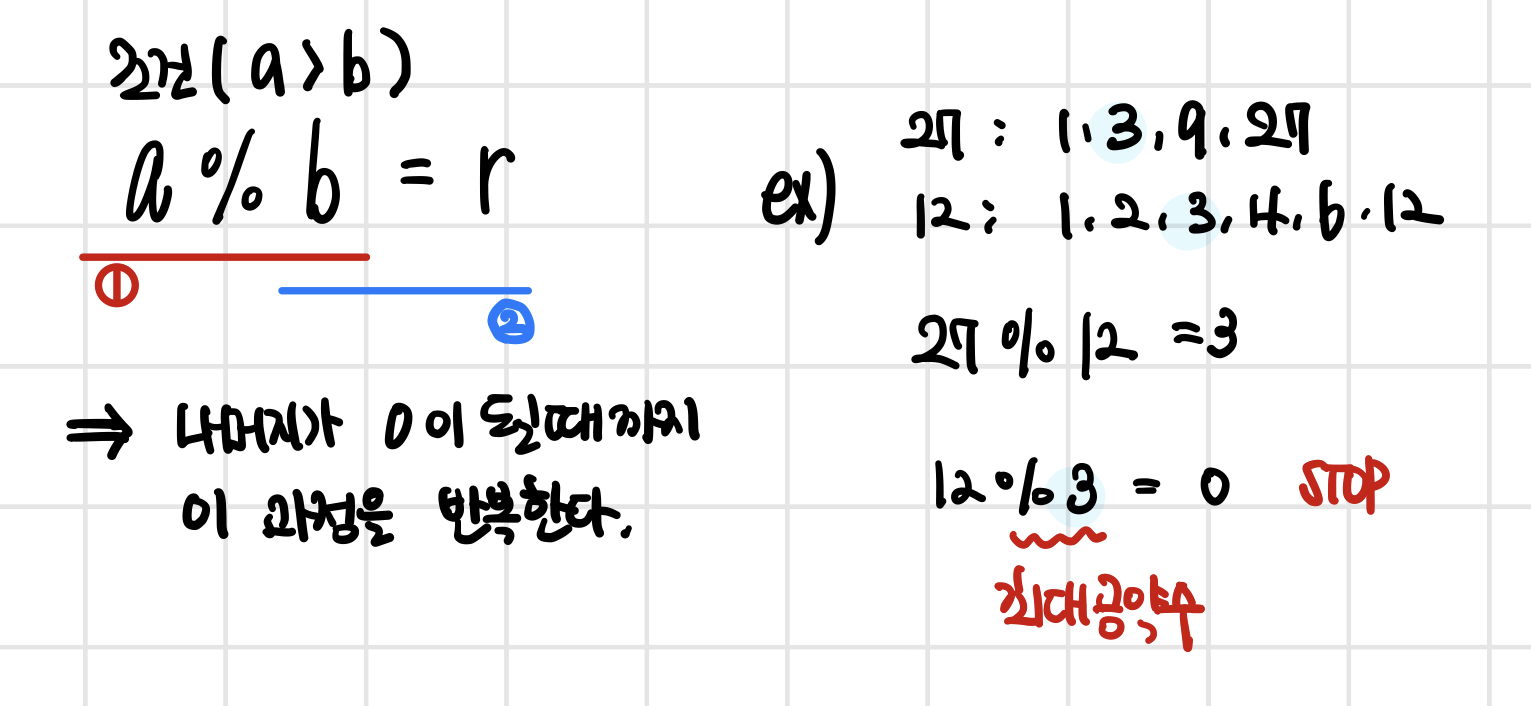 - 2개의 자연수 a, b(a > b) 에 대해서 a를 b로 나눈 나머지를 r이라 하면, a와 b의 최대 공약수는 b와 r의 최대공약수와 같음