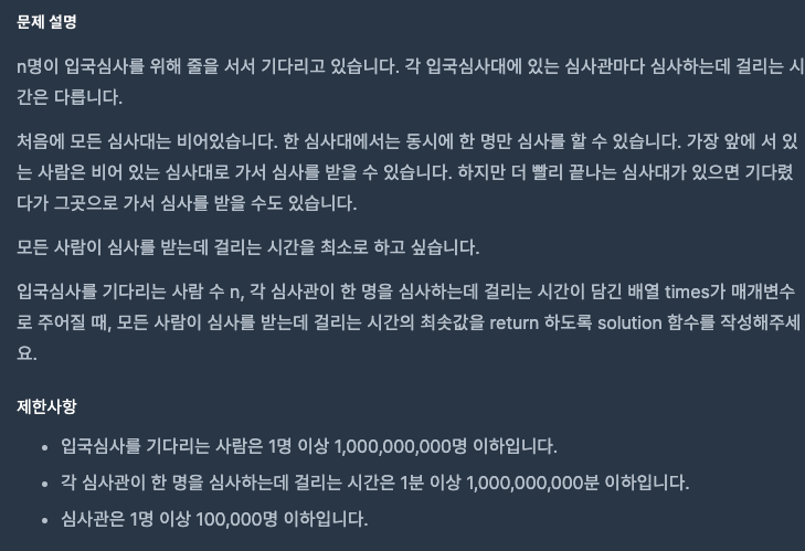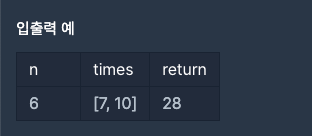 def solution(n, times): start = 0 end = max(times) * n sorted(times) answer = 0 while start <= end: work = 0 mid = (start + end) // 2 for time in times: work += mid // time if work < n: start = mid + 1 else: end = mid - 1 answer = mid return answer'Algorithm > 프로그래머스' 카테고리의 다른 글