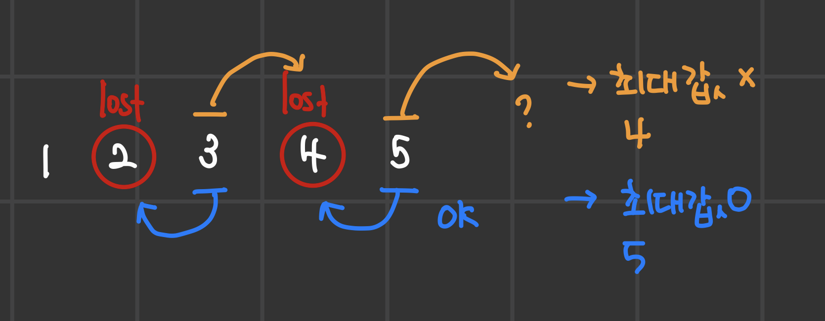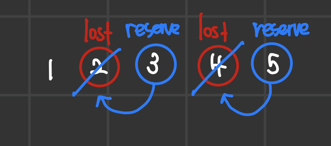 - n = 5, lost = [2, 4], reserve[3, 5] 가정