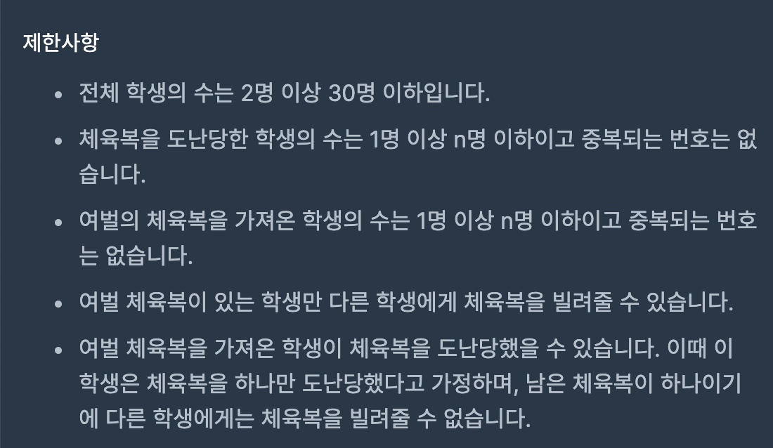 - 제한사항에 여벌 체육복을 가져온 사람도 도난 당할 수 있다 라고 적혀있다 이점을 고려하여, 중복되는 것들은 빼준다.