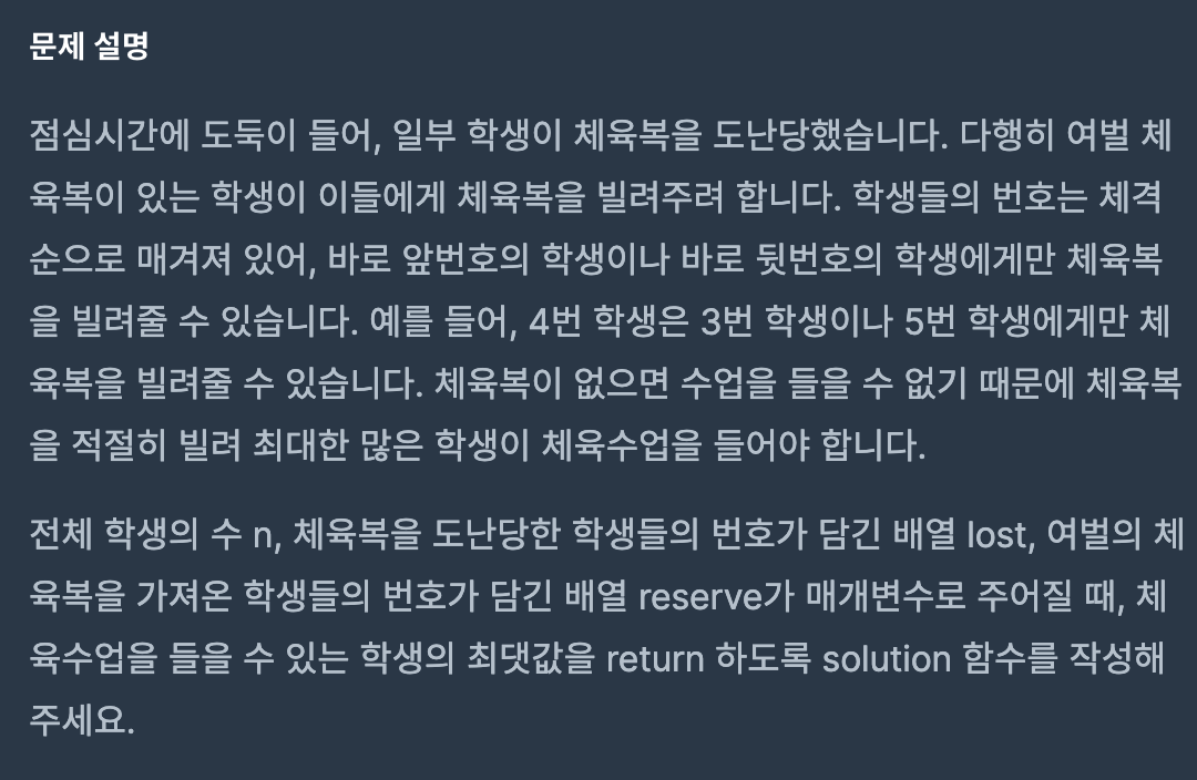 def solution(n, lost, reserve): set_reserve = set(reserve) - set(lost) set_lost = set(lost) - set(reserve) for i in set_reserve: if i-1 in set_lost: set_lost.remove(i-1) elif i+1 in set_lost: set_lost.remove(i+1) return n-len(set_lost)5. 새로알게 된 것 ✏️