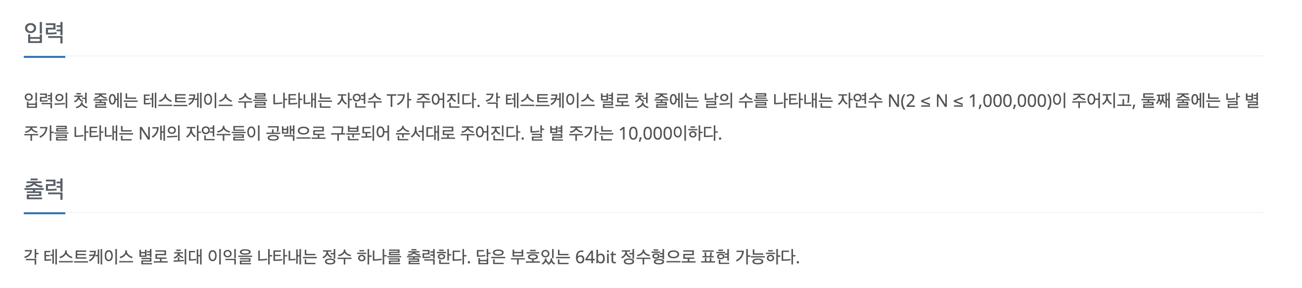 입력값이 큰 것을 보고 그리디인가 dp인가 생각해보다가 제일 큰 값에 팔면 최대 이익이 나오므로 -> 그리디 라고 생각하였다
