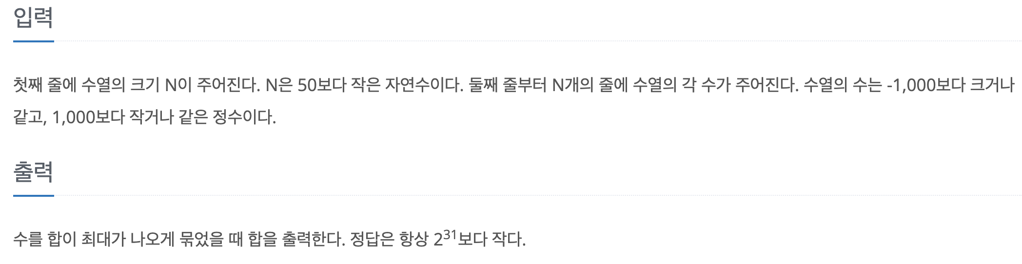import sys input = sys.stdin.readline N = int(input().strip()) negative_arr = [] zero_arr = [] positive_arr = [] for i in range(N): num = int(input().strip()) if num < 0: negative_arr.append(num) elif num == 0: zero_arr.append(num) else: positive_arr.append(num) positive_arr.sort() negative_arr.sort(reverse = True) answer = 0 while negative_arr: max_num = 0 num = negative_arr.pop() another_index = -1 zero_flag = False for i in range(len(negative_arr)): # 경우의 수1) if num * negative_arr[i] > num + negative_arr[i]: another_index = i max_num = num * negative_arr[i] # 경우의 수2) else: max_num = num another_index = -1 # 경우의 수3) 음수 상쇄 for i in range(len(zero_arr)): if max_num <= num * 0: zero_flag = True if zero_flag: answer += 0 zero_arr.pop() # 겅우의 수4) 묶이지 않는 경우 elif another_index == -1: answer += num # 두 수로 묶이는 경우 else: answer += max_num negative_arr.pop(another_index) while positive_arr: num = positive_arr.pop() another_index = -1 max_num = 0 for i in range(len(positive_arr)): # 경우의 수1) if positive_arr[i] * num > positive_arr[i] + num: another_index = i max_num = positive_arr[i] * num # 경우의 수2) else: another_index = i max_num = positive_arr[i] + num # 경우의 수3) 묶이지 않는 경우 if another_index == -1: answer += num # 두 수로 묶이는 경우 else: answer += max_num positive_arr.pop(i) print(answer)'Algorithm > 백준' 카테고리의 다른 글