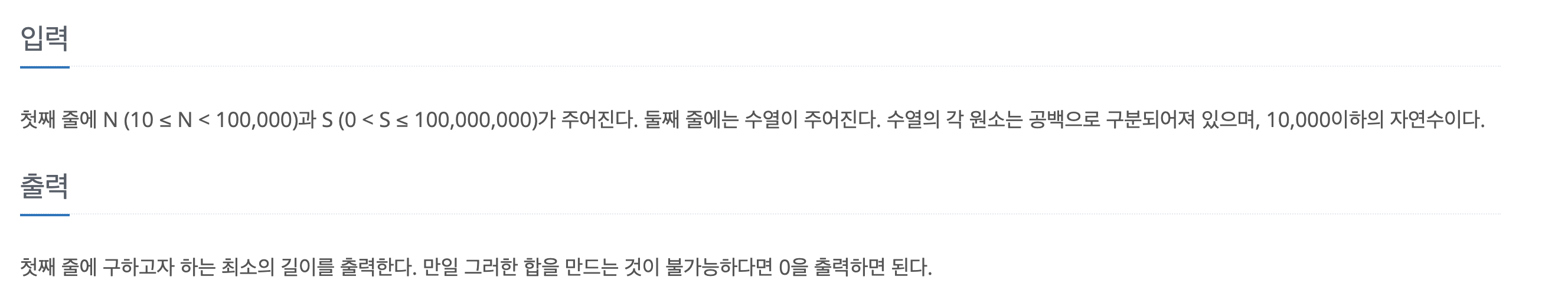 첫째 줄에 N (10 ≤ N < 100,000)과 S (0 < S ≤ 100,000,000)가 주어진다. 둘째 줄에는 수열이 주어진다. 수열의 각 원소는 공백으로 구분되어져 있으며, 10,000이하의 자연수이다.